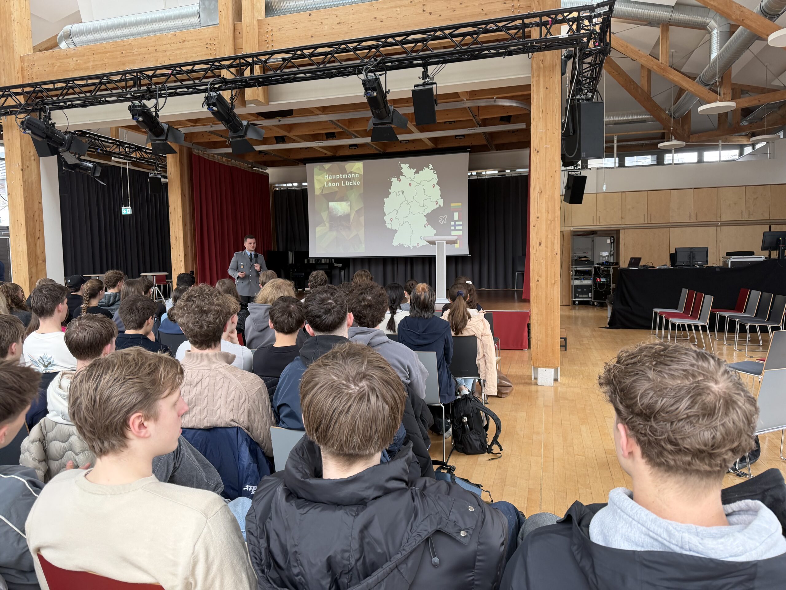 Seit ihrer Gründung leistet die Bundeswehr ihren Beitrag zum Schutz unseres Landes, ihre Aufgaben sind heute vielfältiger denn je. Zudem ist das Thema Bundeswehr u.a. Teil des Lehrplans für die Q12. Die grundsätzliche Wiedereinsetzung der Wehrpflicht für Männer ruft besonders bei unseren männlichen Schülern viele Fragen und Ängste hervor. Es war uns daher eine besondere Freude, Herrn Hauptmann Léon Lücke, einen Jugendoffizier der Bundeswehr, am 12.03.2026 bei uns begrüßen zu dürfen. Bei seinem Vortrag vor Schülern und Schülerinnen der Q12 ging es ausdrücklich NICHT darum, für die Bundeswehr zu werben oder zu rekrutieren, sondern seine Erfahrungen im Wehrdienst mit uns zu teilen und Fragen der Schüler und Schülerinnen zu beantworten. Dies stieß auf eine sehr positive Resonanz seitens unserer Schülerschaft und wir bedanken uns herzlich bei Herrn Hptm. Lücke für seine Arbeit, seine Zeit und seinen Dienst für unser Land.